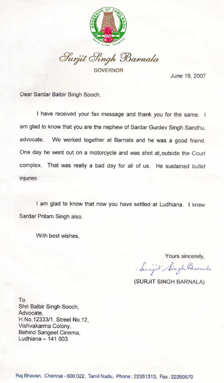 My family members felt very encouraged after getting a personal Registered Letter dated June 19, 2007 from your honour, unfolding the whole episode of old association with our family in a few words, always to remain historical as part of our family history.